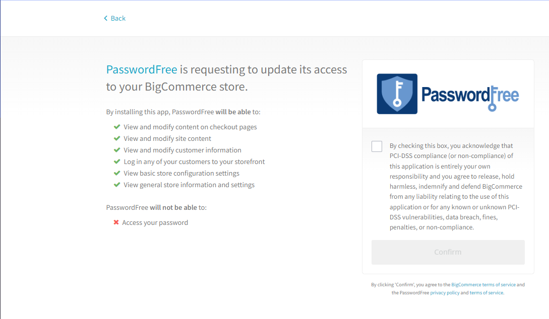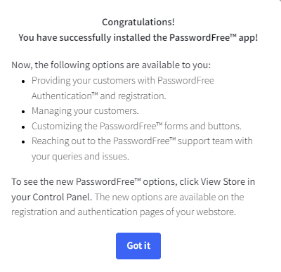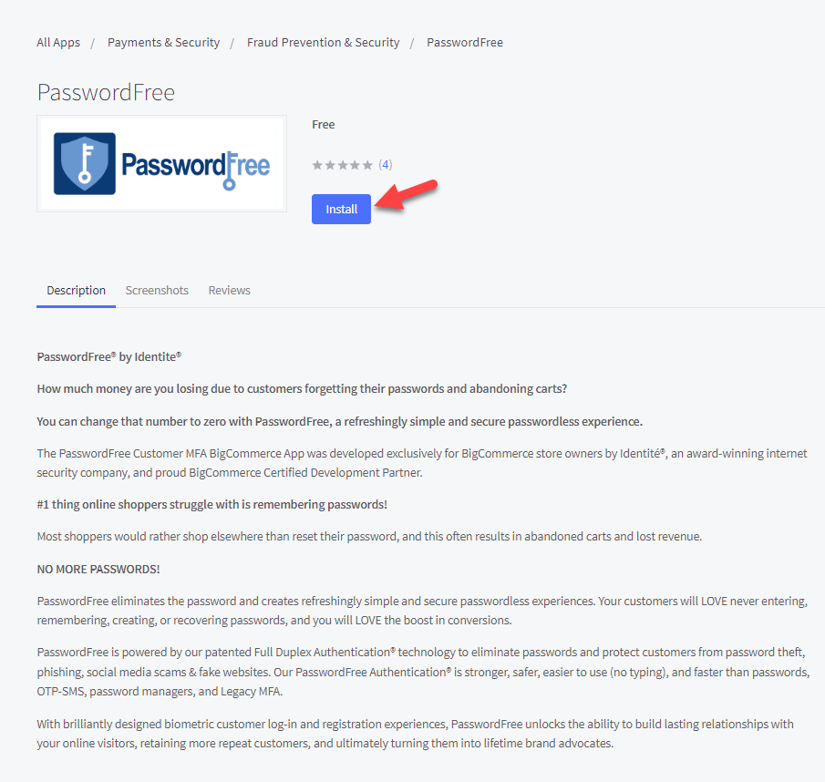 You can install the PasswordFree app either from the BigCommerce marketplace or from the BigCommerce control panel of your store.