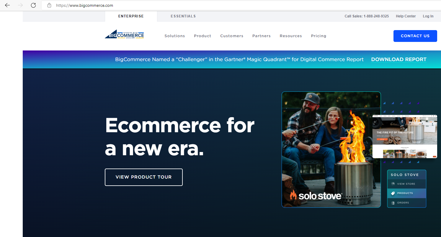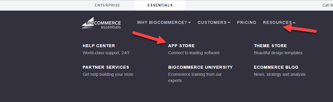 1. On the BigCommerce website (https://www.bigcommerce.com/), click ESSENTIALS.