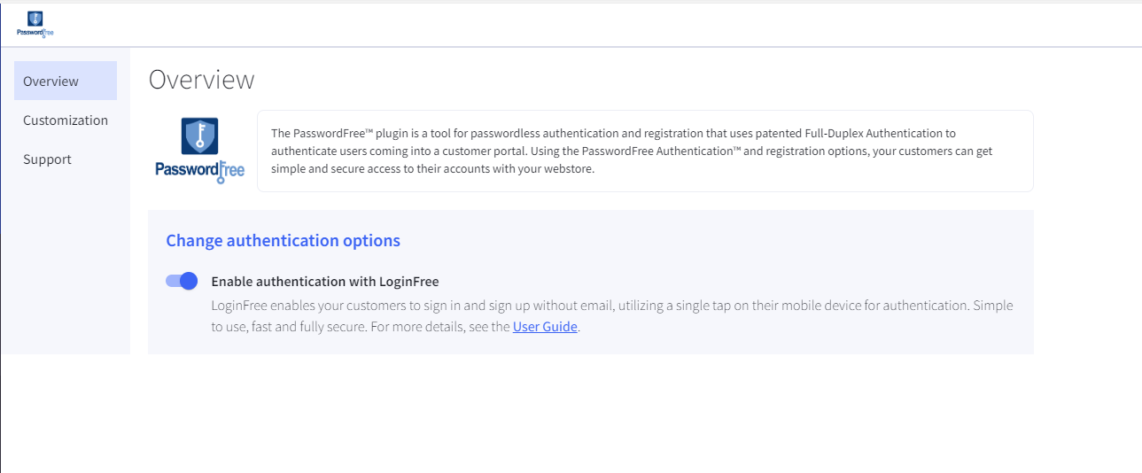 1) Overview. This section contains the brief description of the PasswordFree app and the option of LoginFree authentication. For more details, see LoginFree authentication.