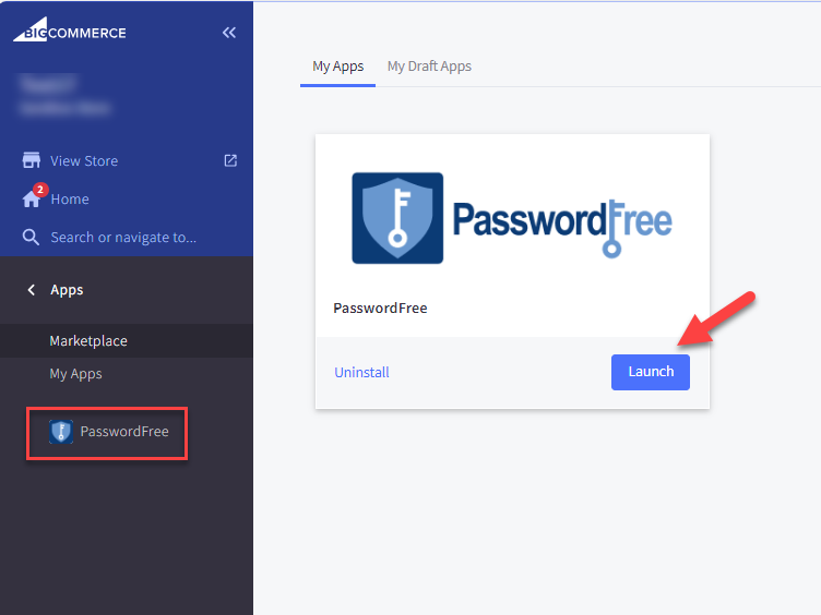 1. In your BigCommerce control panel, navigate to Apps>My Apps. Select PasswordFree and click Launch.