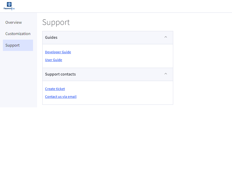 - Support contacts list: link to the PasswordFree Support center and to the support@identite.us mail address.