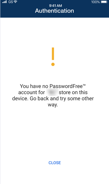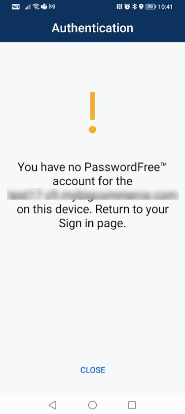 9) If you have no PasswordFree account registered on this BigCommerce webstore with this mobile device, the following notification is displayed in your PasswordFree mobile app.