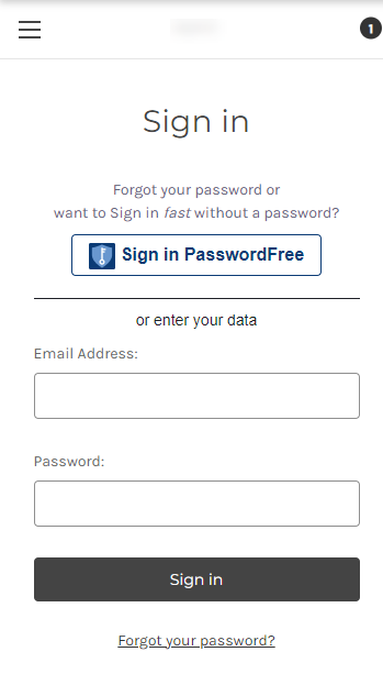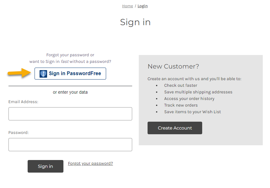 You can sign in to your account on the BigCommerce webstore without entering your email address only if the Store Owner has enabled this option for the customers. Otherwise, you can sign in with your email address as described in Procedure 2. The LoginFree User Authentication is disabled of the User authentication section.