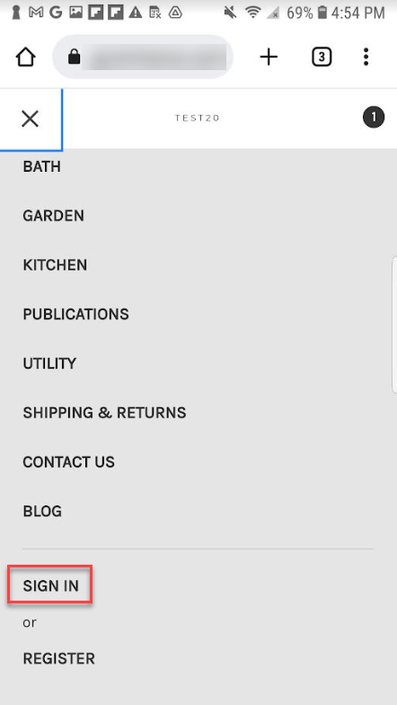 1. Open the browser on your mobile device and navigate to the BigCommerce webstore homepage.Tap the hamburger menu in the upper left corner of the page.
