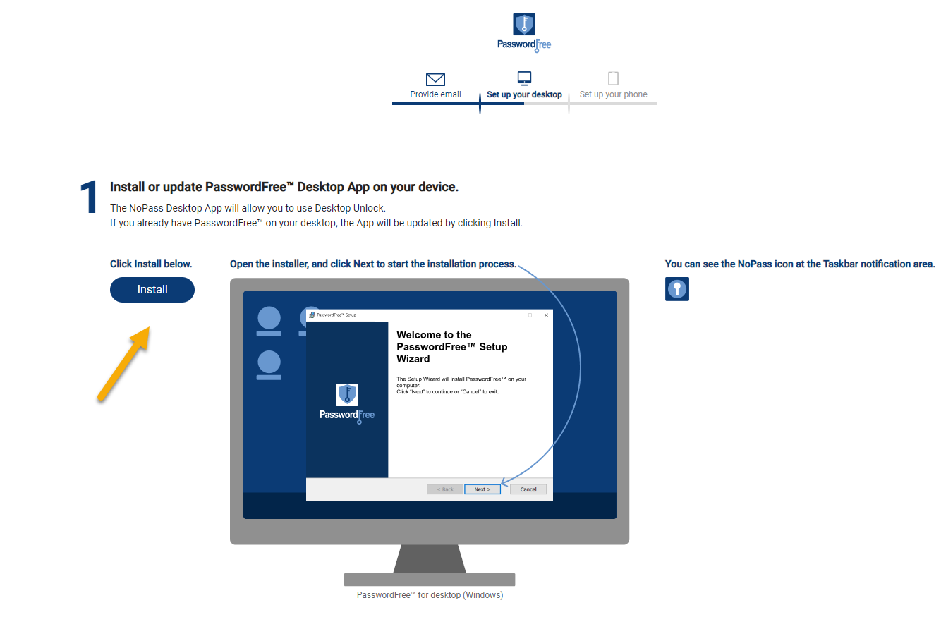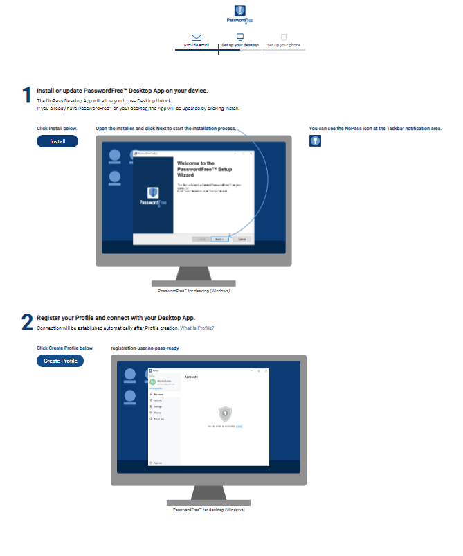 2) To download and install the PasswordFree desktop app, click Install in Step 1. Then, follow the Installing the PasswordFree Desktop app and creating a Profile procedure.
