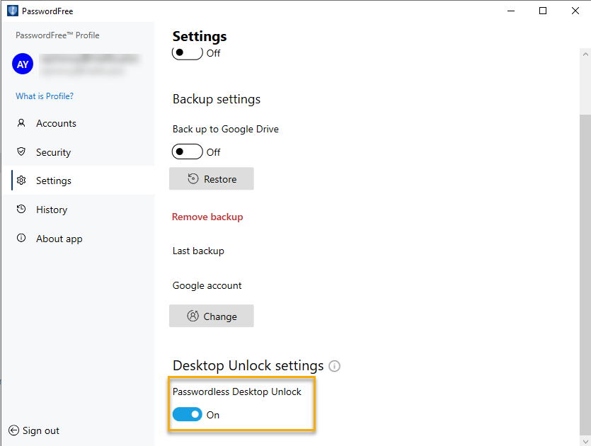 Now that you have installed the PasswordFree desktop app on your Windows computer and the PasswordFree mobile app on your mobile device, and signed in to your Profile both in your PasswordFree desktop and mobile app, your next step is to enable the PasswordFree Desktop Unlock feature.