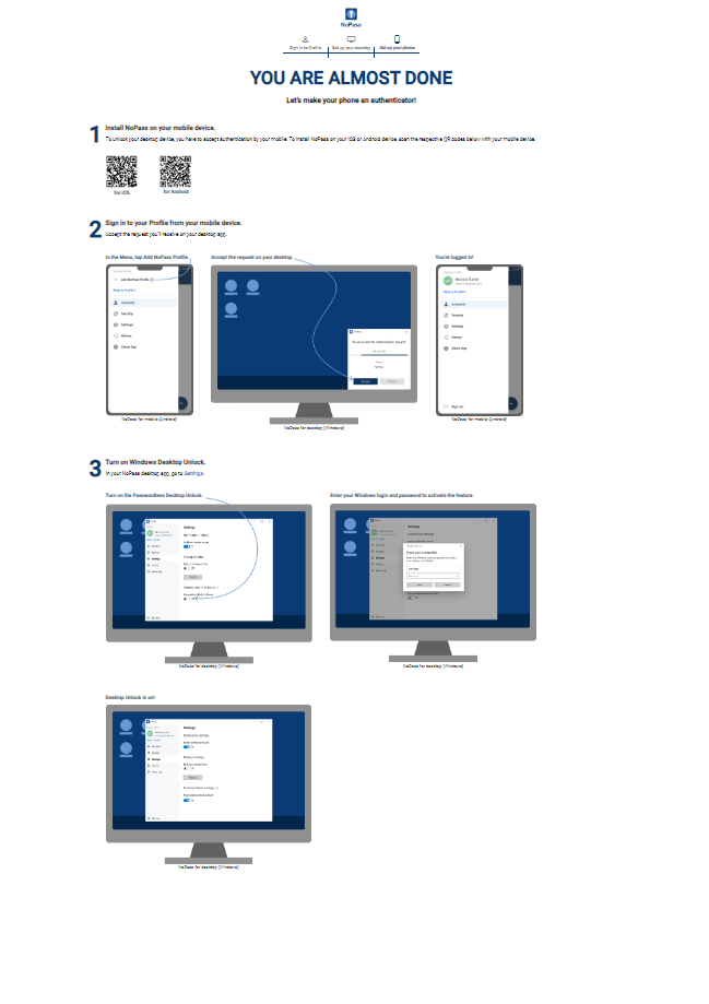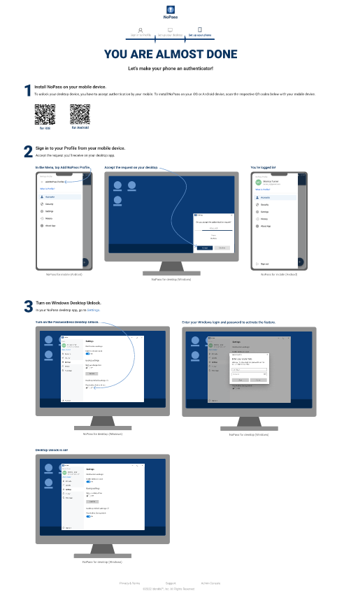 To start using the Desktop Unlock feature, download and install the PasswordFree desktop app while creating your PasswordFree Profile. If the PasswordFree desktop app has already been installed on your PC and your Profile is already created, go to Signing in to your Profile in the PasswordFree mobile app.