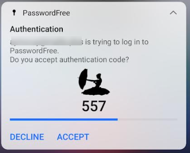 4. If all the preconditions are fulfilled, a push notification is sent to your device where you are signed in (but not to the current PasswordFree desktop app) and is simultaneously displayed on your desktop screen.