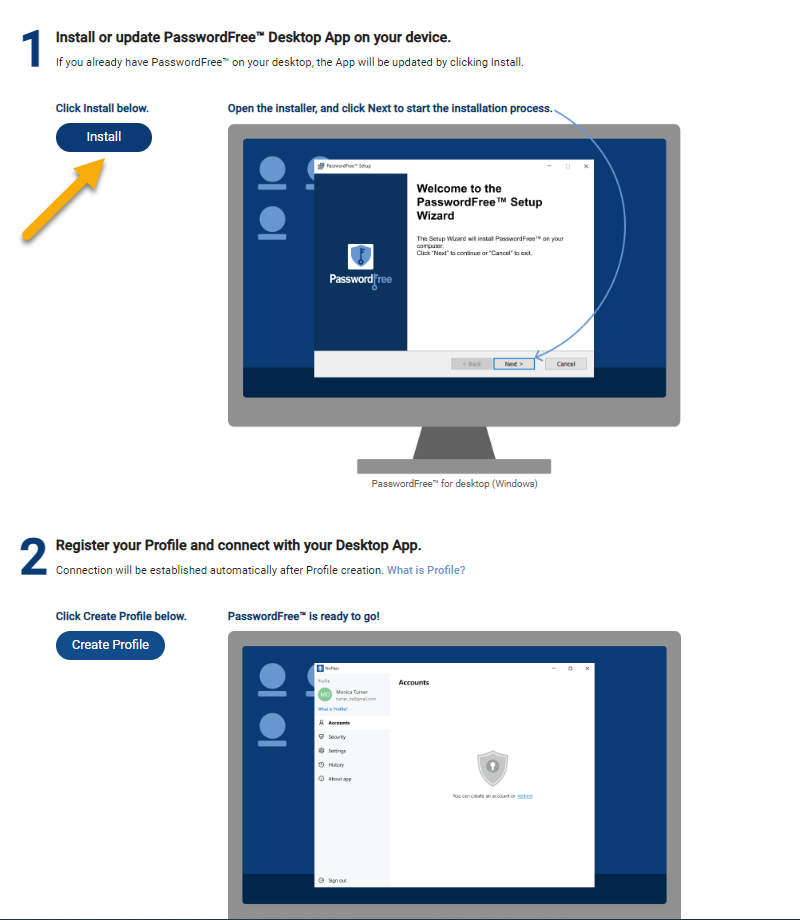 You can download and install the PasswordFree mobile and desktop app simultaneously with registration of your account on the website with PasswordFree integrated into it.