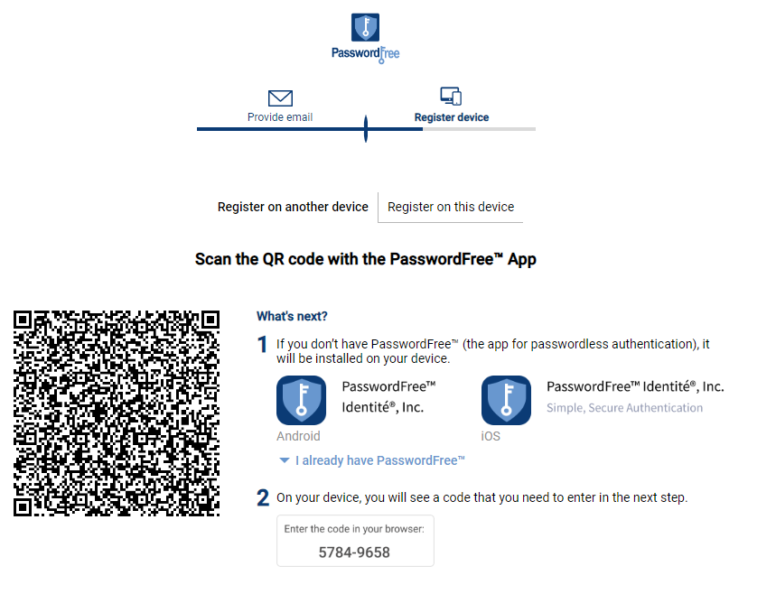 1) Scan the QR code with your mobile device scanner and download the PasswordFree mobile app from Google Play or App Store.