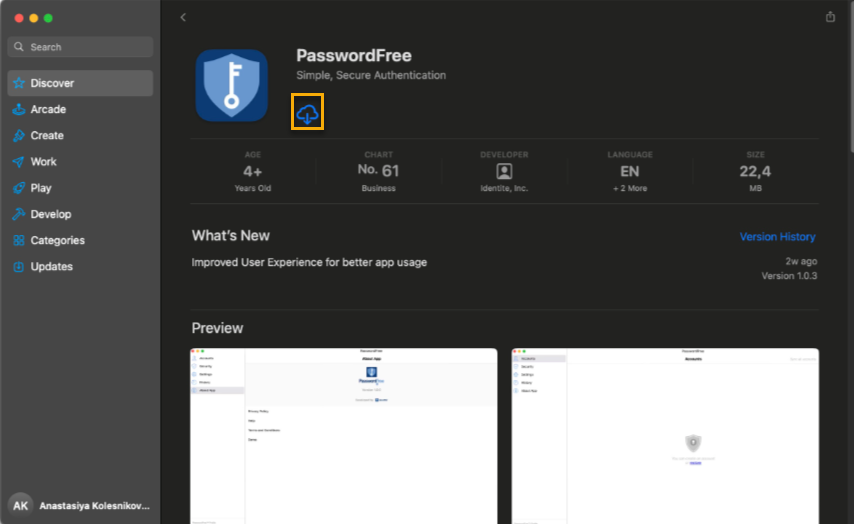 1. On your macOS computer, you are redirected to the App Store marketplace and the PasswordFree app page is displayed on your screen. Click the downloading icon, then click Open.