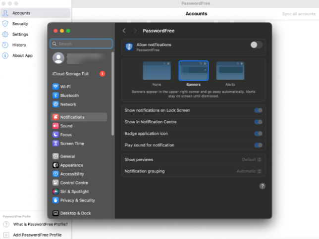 Select PasswordFree from the list of applications and switch on the toggle Allow Notifications.