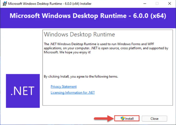 2. Make sure .Net Runtime is installed on your computer. Otherwise, click Install in the following dialogue box to install the necessary software.