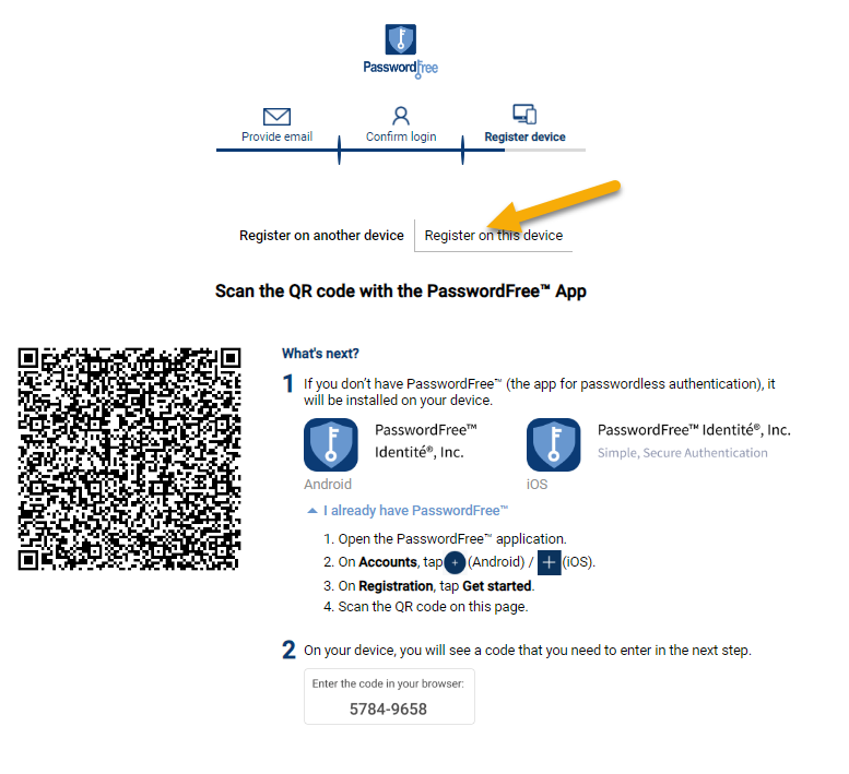2) Scan the QR code with the PasswordFree app on your other device or tap the QR code to install the PasswordFree app on the same device.