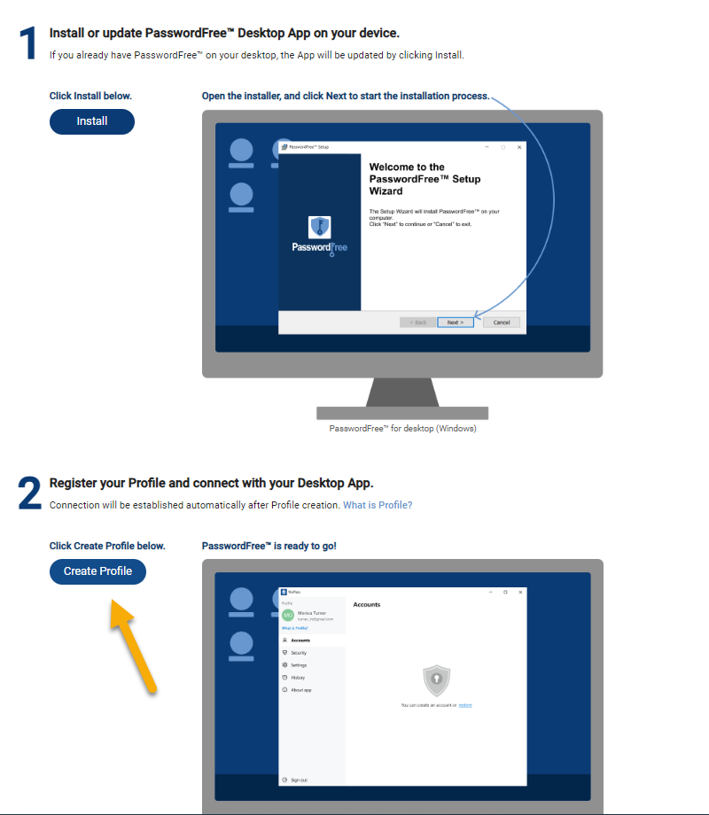 4) After the PasswordFree desktop app is successfully installed, click the Create Profile button to create your PasswordFree Profile.