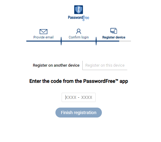 6) Enter the 8-digit code from the PasswordFree mobile application in your browser and click Finish registration.