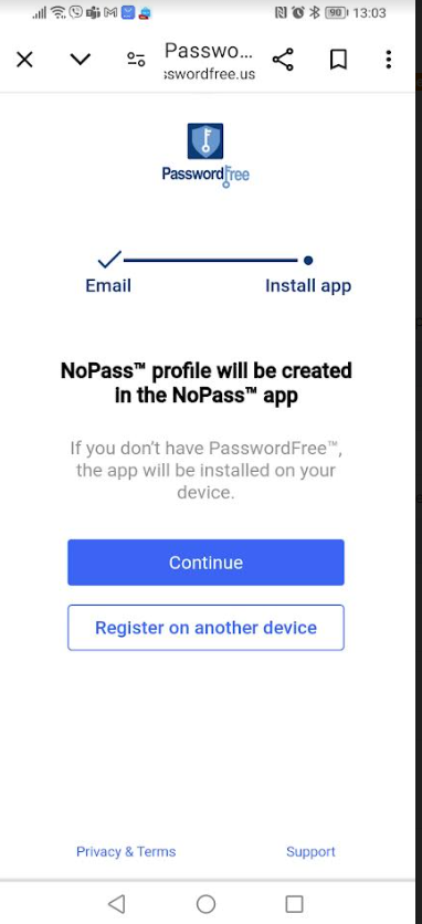 - Tap Register on another device to register the PasswordFree app on your other device.