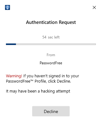 If someone is trying to recover your Profile, PasswordFree helps to detect this malicious activity. In this case, you will get the push notification and will have 60 seconds to decline the recovery attempt: