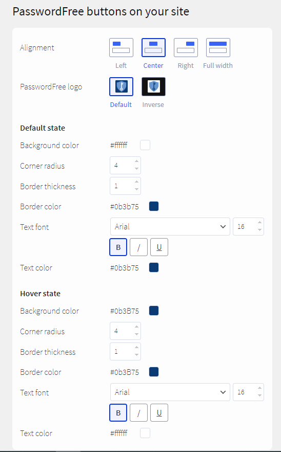 After installation of the PasswordFree plugin into your WordPress website, you can customize the PasswordFree buttons in line with your WordPress website design concept. The procedure below describes how you can customize the Sign in PasswordFree and Sign up PasswordFree buttons.