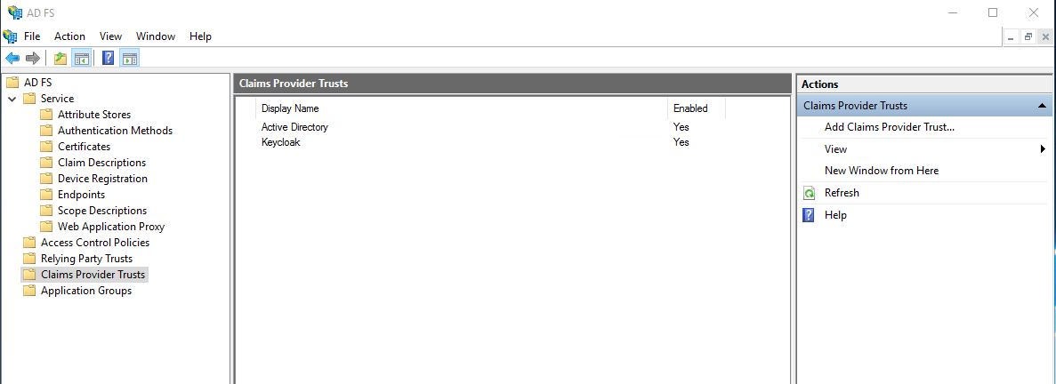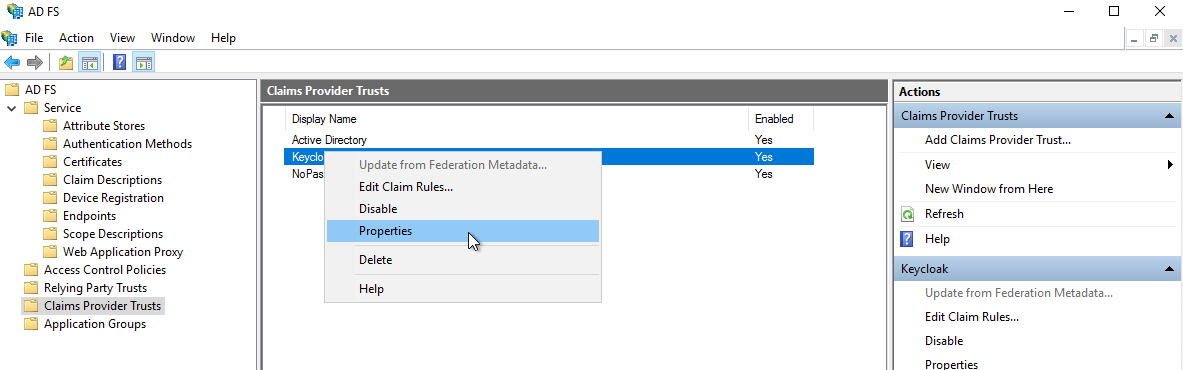 - In the AD FS Management console, select the Claims Provider Trusts folder, and under Keycloak select Properties.