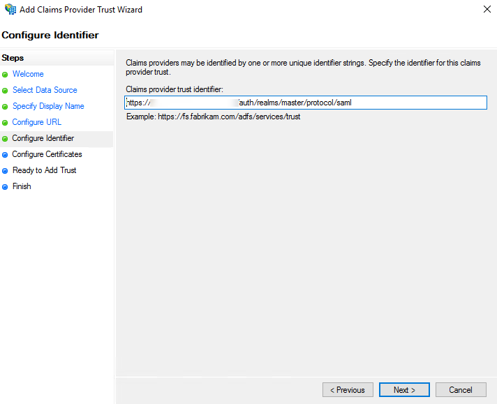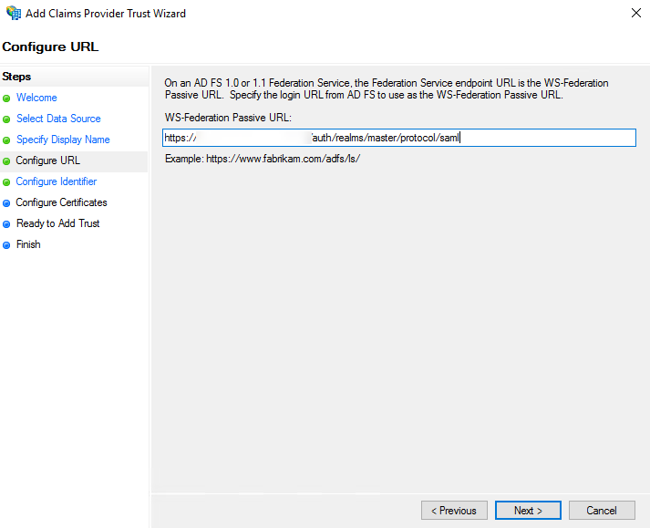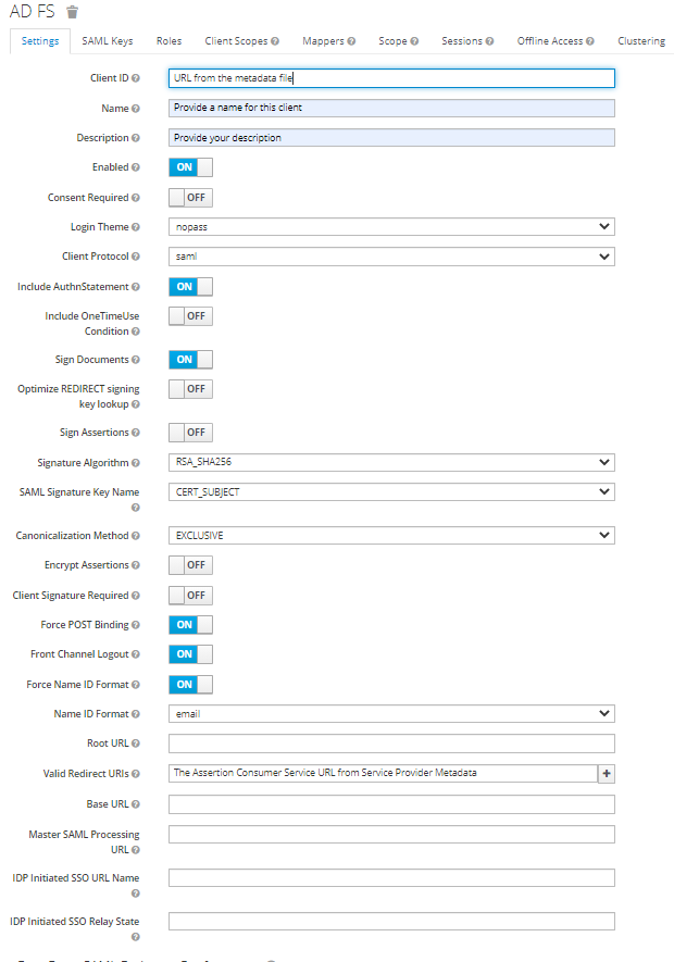 https://<adfs.domain.name>/FederationMetadata/2007-06/FederationMetadata.xml - Import the AD FS SAML metadata to Keycloak.