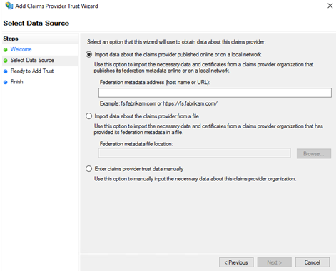 - On the right pane, select Add Claims Provider Trust to open Wizard.