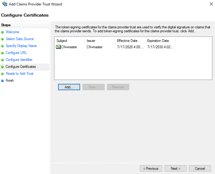 - In Configure Certificates, add the token-signing certificate from the Keycloak provider.
