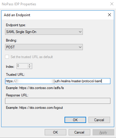 In the NoPass IDP Properties, select Endpoints, and do the following: