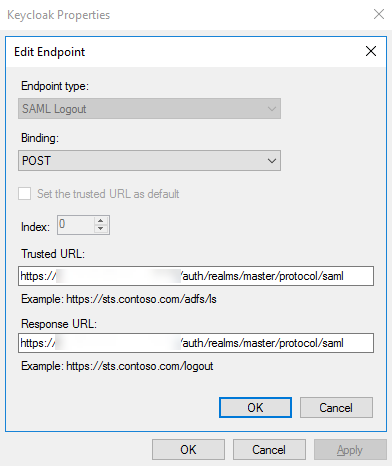 In Edit Endpoint, in the Endpoint type list, select SAML Logout. In Binding, select POST. In the Trusted URL, enter your service provider URL.