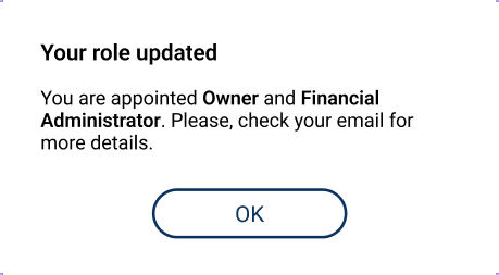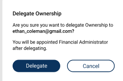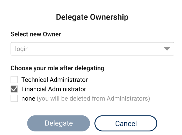 - To delegate both the Owner and the Financial Administrator roles, perform the following steps: