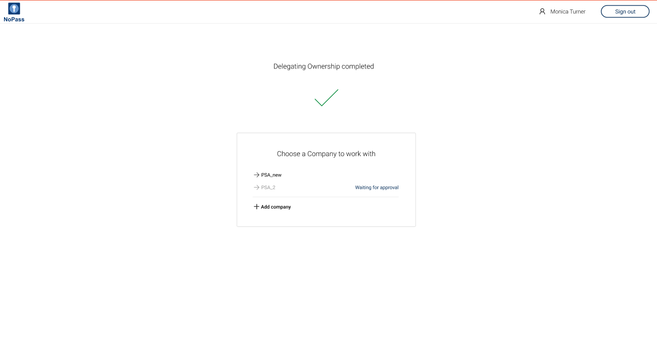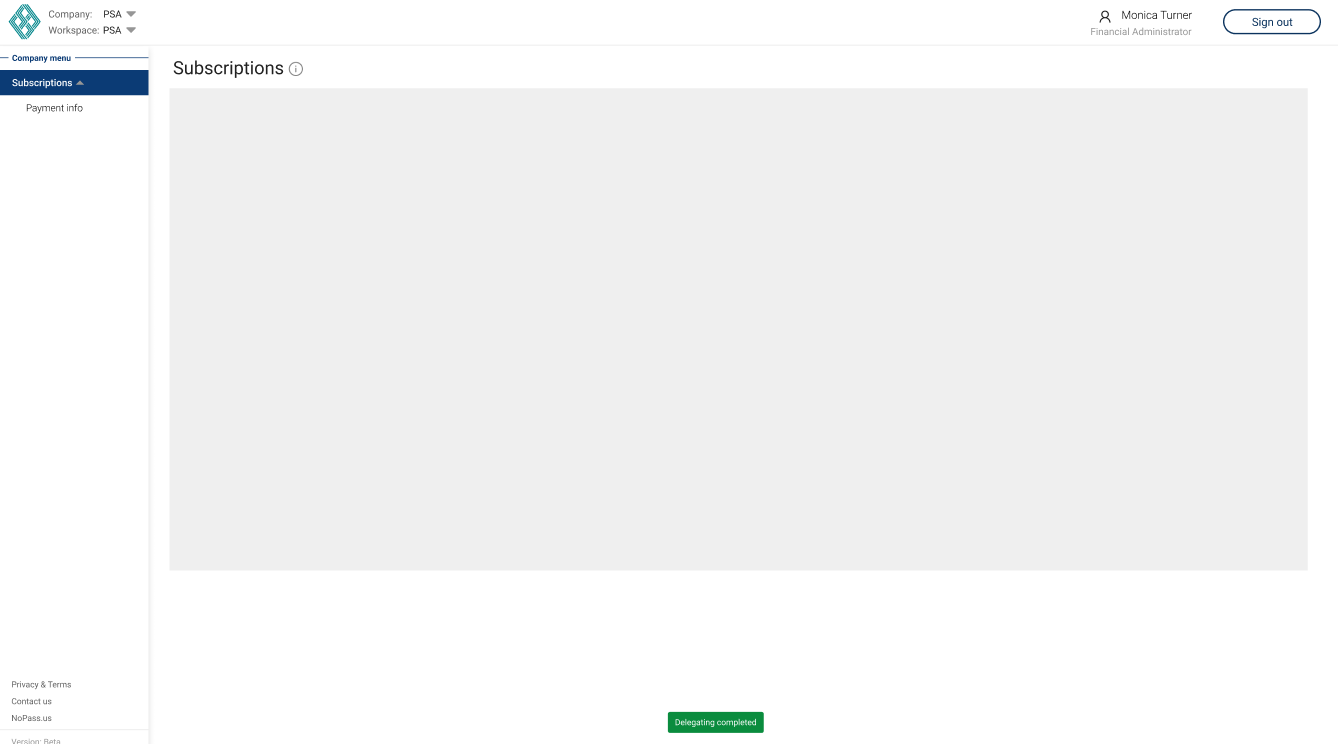iii. After you click Delegate, your roles in the Admin Panel of the given Company are changed and the following notification is displayed at the bottom of the page.