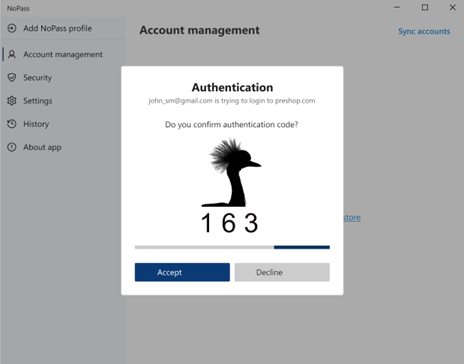 - Compare the picture and three-digit code on your login page with the one appearing on any of your signed-in to NoPass™ profile devices. If they are the same, tap Accept on the push notification on your mobile device or click Accept in the NoPass™ Desktop application.
