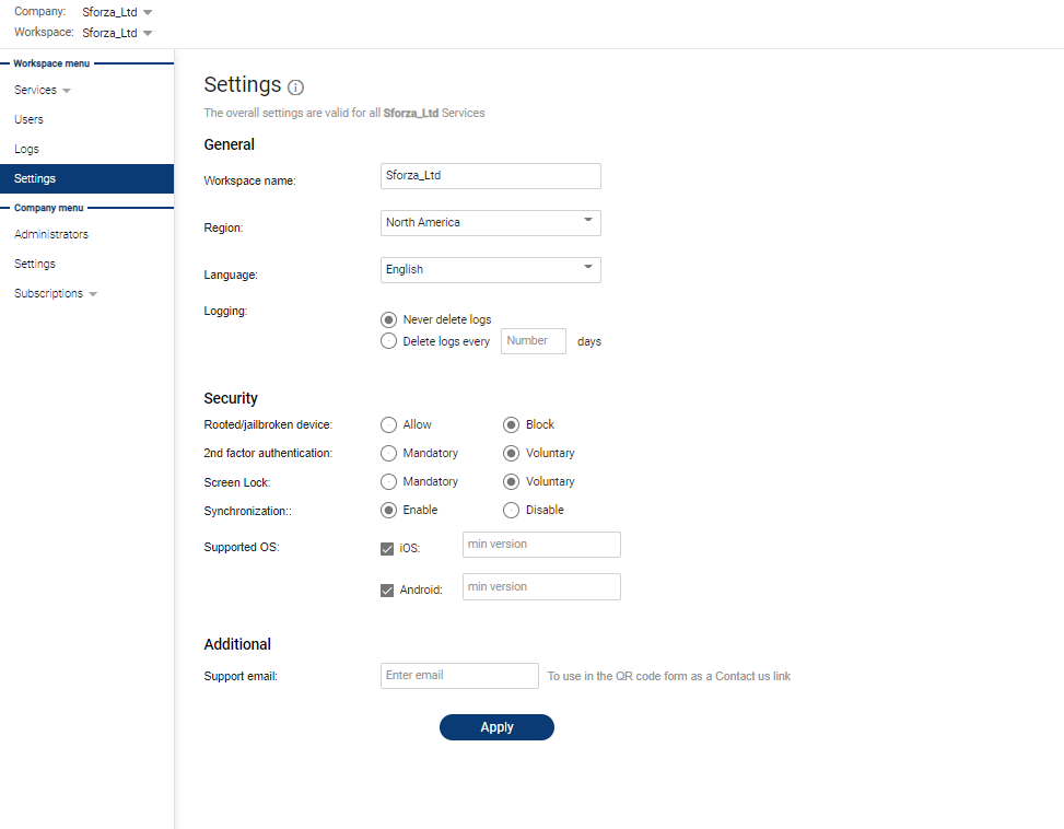You can set up settings that would be available for all Services of the respective Workspace.