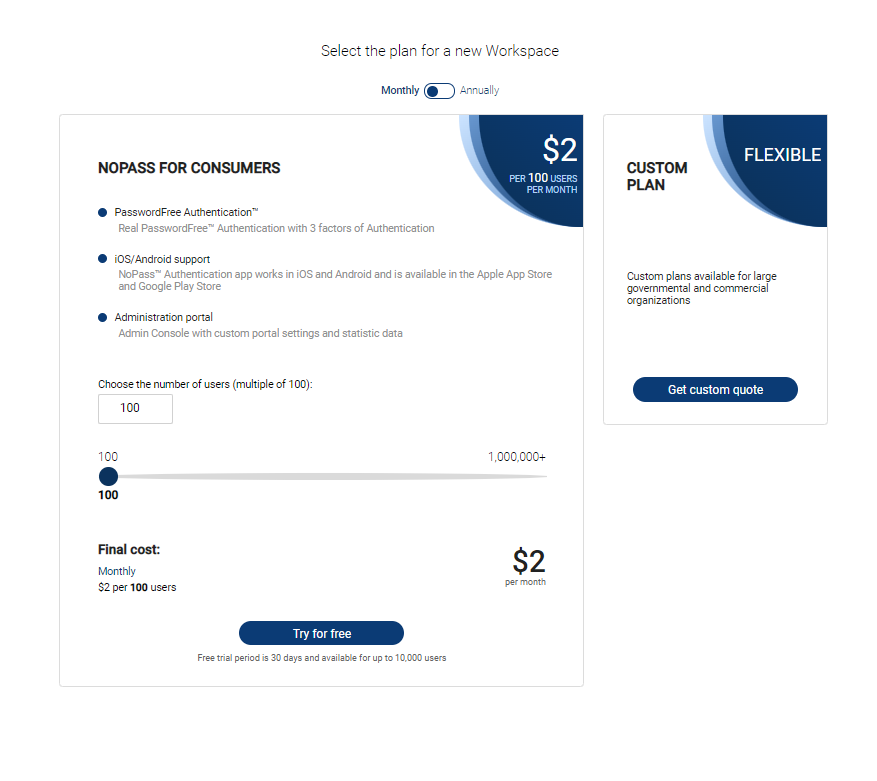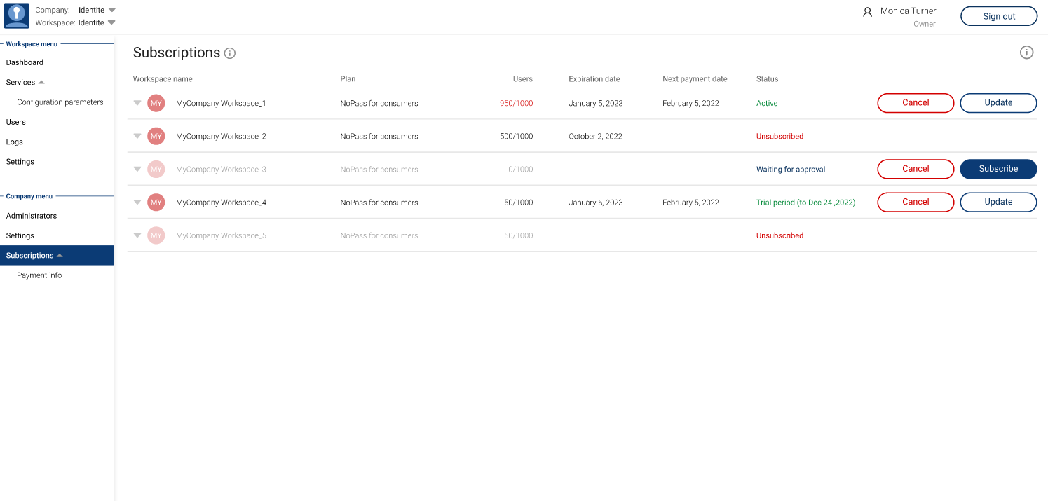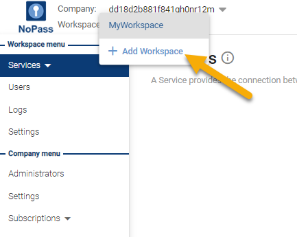 Your first Workspace is added to the Company automatically as soon as you purchase your first NoPass™ subscription. Workspace is the place where you as an Administrator can create Services, manage users, settings, and analyze reports. It is possible to create more than one Workspace within a Company, though every new Workspace requires a new subscription and acts as a separate tenant with its particular set of Services, users, and settings.