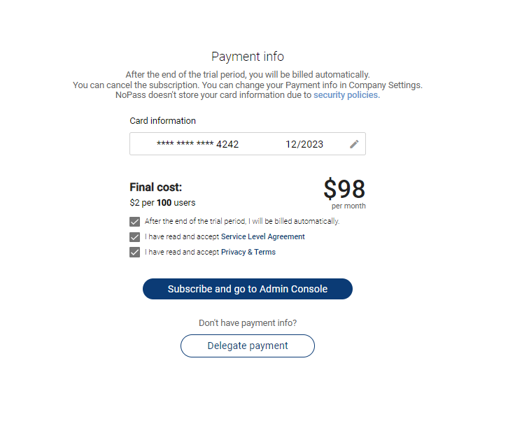 iv. In case the financial manager is not authorized to perform the payment, they can delegate payment. Otherwise, the financial manager shall fill in the Card information in the following window, select the I have read and accept the Service Level Agreement and I have read and accept Privacy and Terms check boxes, and click Subscribe and go to Admin console.