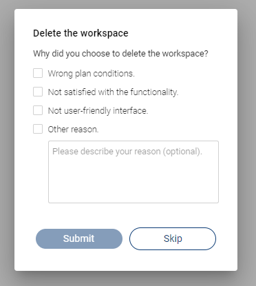 4. Before your Workspace is deleted, fill in the following form as to the reasons for such deleting.
