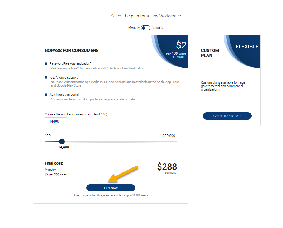 1. If you set up the number of users exceeding 10,000 users, the Subscription shall not offer a trial period. Then, click Buy now.