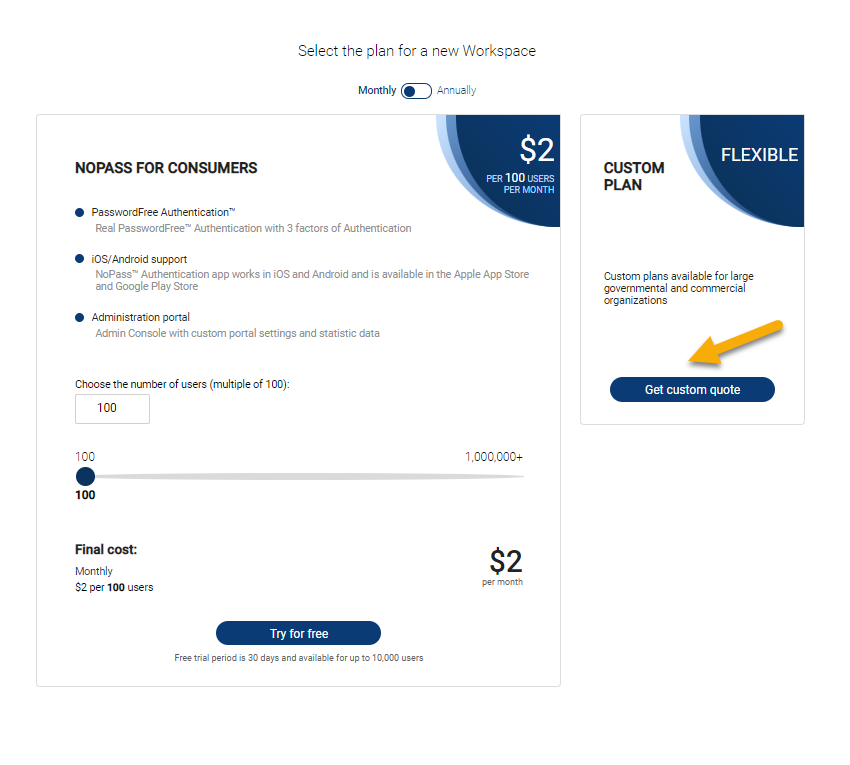 2. Select the type of payment: monthly or annually by moving the toggle.
