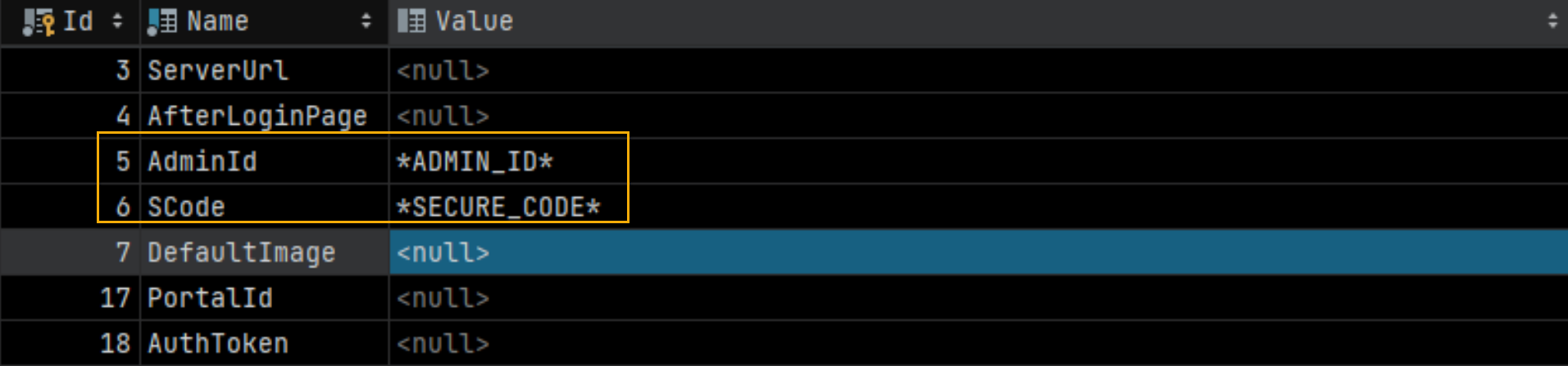 Let's assume that for the Preshop portal, the Admin ID and S-code values are available in the Settings of the Preshop database.