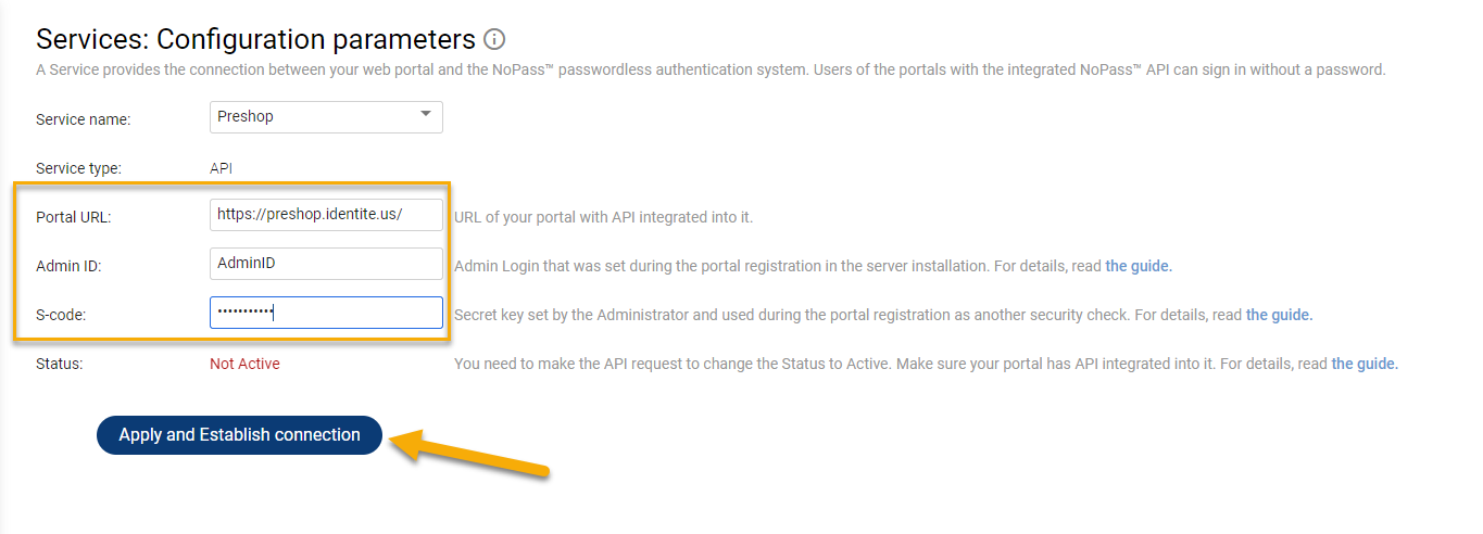 Both Admin ID and S-code are set when integrating the NoPass™ APIs into your portal (see NoPass™ API Integration).