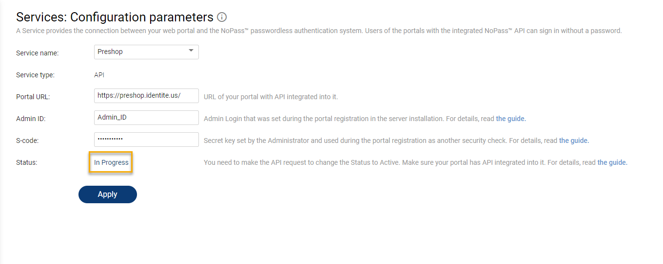 To add the first Service, you shall have to make your first API request. Before this, make sure that your Service portal has all necessary APIs integrated into it. The APIs to be integrated into the backend of your portal and the methods to be used are described here: NoPass™ API Integration. During APIs integration, you set up the Admin Login (AdminID) and the secret key (S-code) which will be used later in Service creation.